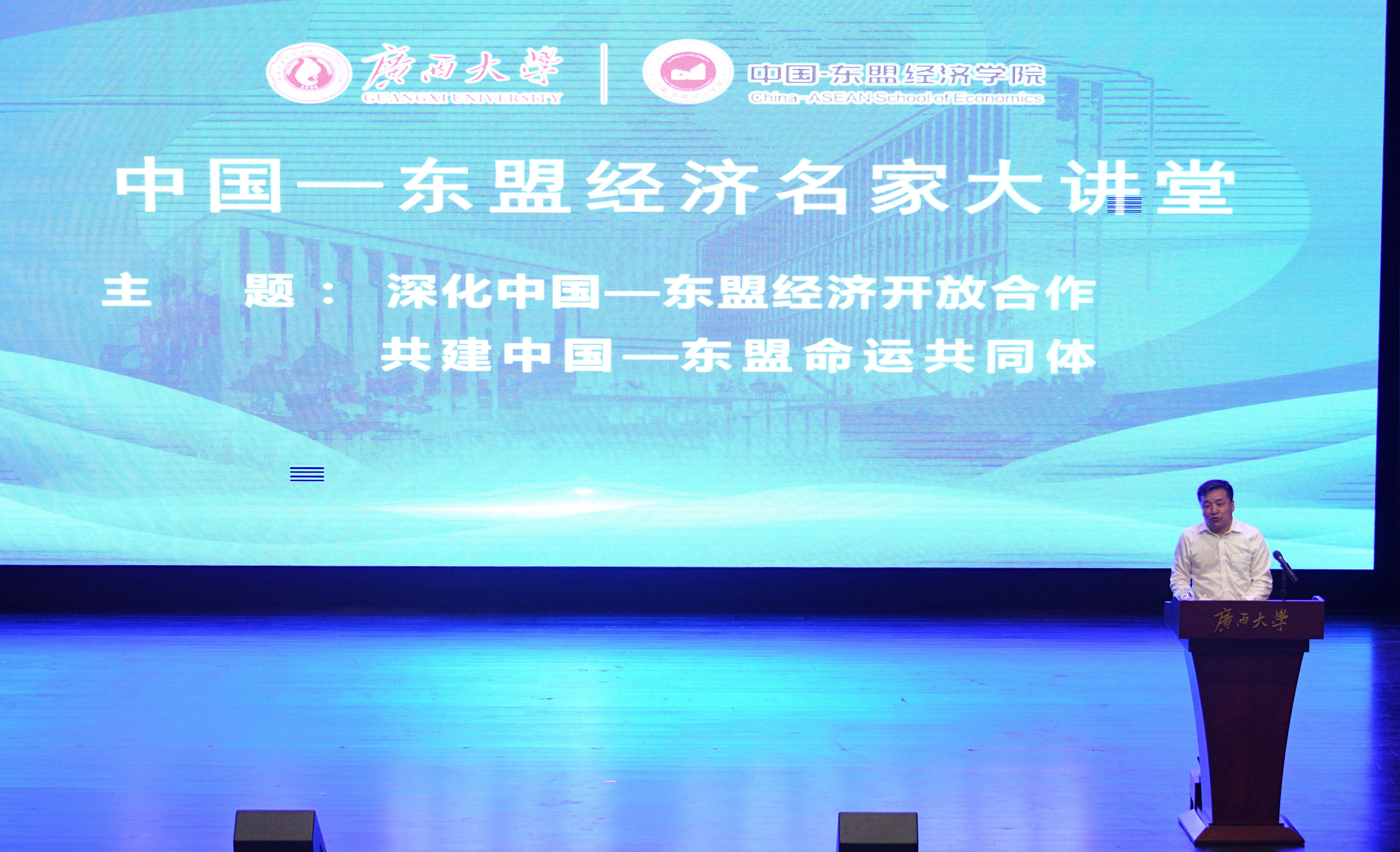 After the inauguration ceremony, the first "China - ASEAN Economic Lecture" was held in Hui Xue Hall of Guangxi University. Zheng Xinli, former deputy director of the Central Policy Research Office of the Communist Party of China, Hu Suojin, Xia Fei and other famous domestic experts made reports for the 150 present representatives of teachers and students of Guangxi University, talking about deepening China-ASEAN economic open cooperation and building China-ASEAN community of destiny.