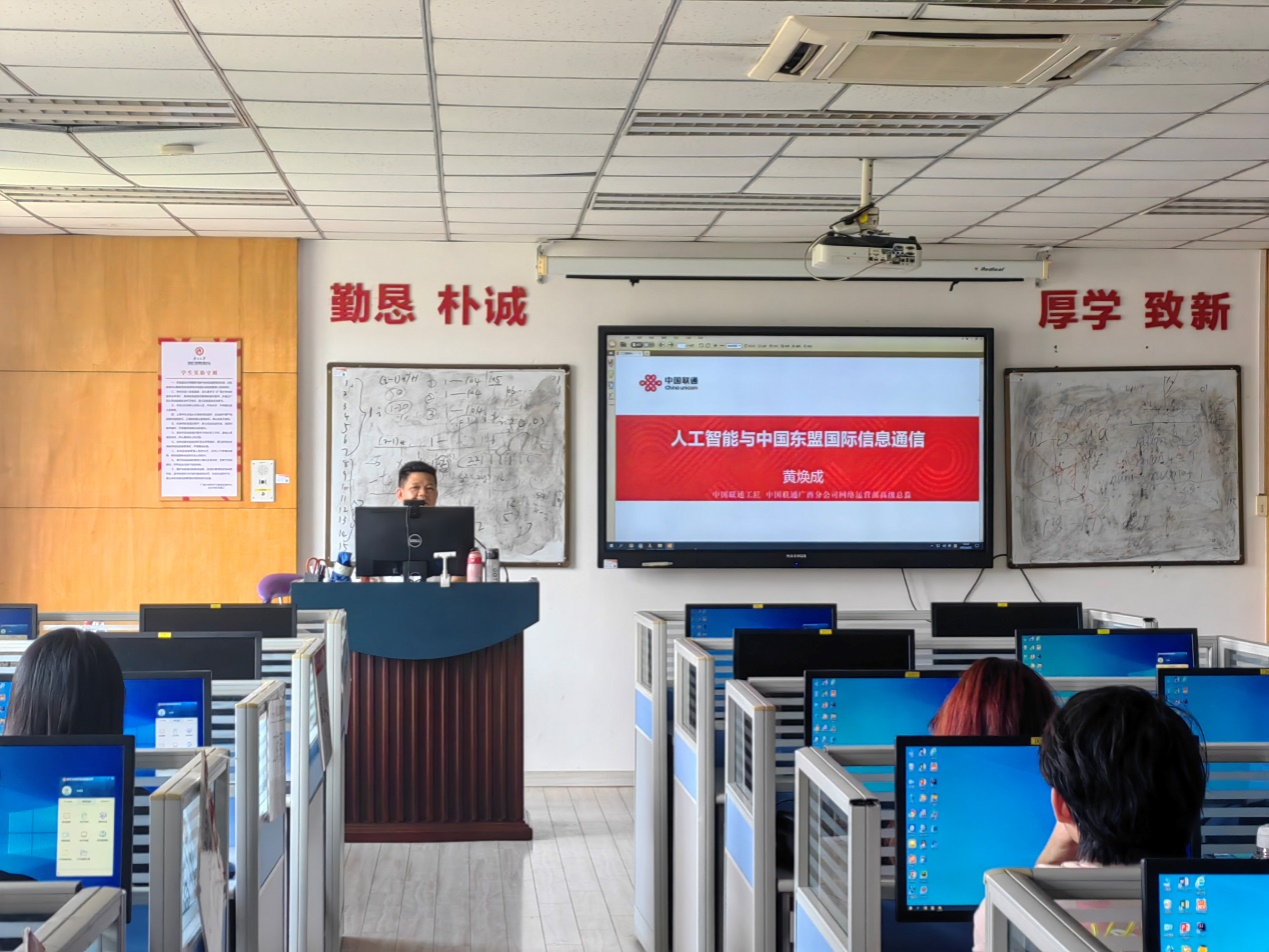 课程聚焦人工智能技术前沿,系统梳理了智能计算的发展历程与最新突破,深入探讨了人工智能的安全挑战及中国智能计算产业的机遇。结合中国—东盟信息通信合作背景,授课专家黄焕成基于中国联通南宁国际局的业务实践,生动解析了AI技术在跨境物流、通信运维等领域的创新应用:无人机智能巡检结合AI图像识别提升运维效率,无人驾驶运输融合智能监控技术优化风险预警,AI算法驱动的故障分析系统大幅缩短网络修复时间。这些真实案例使抽象的技术理论更加直观,帮助学生深入理解行业实践。