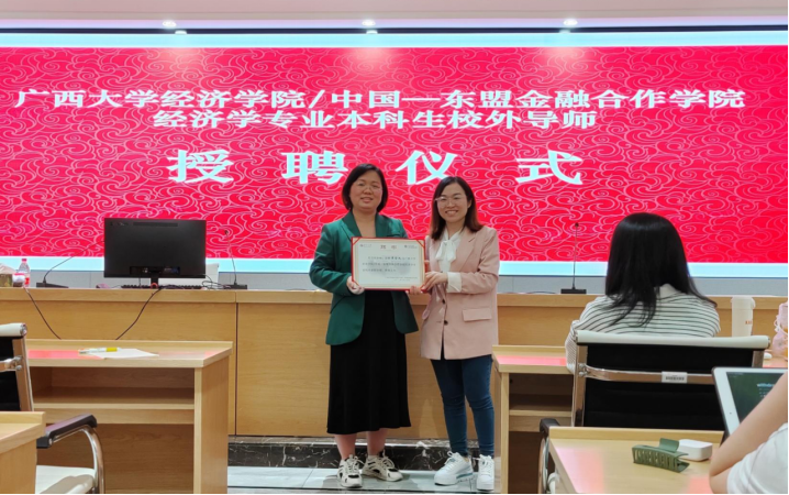 《政治经济学(二)》课堂,给2020级经济学专业全体本科生带来了题为“广西工业振兴的现实基础和相关思考”的专题讲座和“谋定而后动,笃行以致远——关于大学生职业规划”的建议。讲座由经济学系主任郭南芸主持,学院院长助理盛玉雪参与了本次讲座。讲座前,盛玉雪院长助理介绍了经济学专业开展校企共建课程暨校外导师系列讲座情况,并代表学院为黄金凤副所长颁发了校外兼职导师聘书。