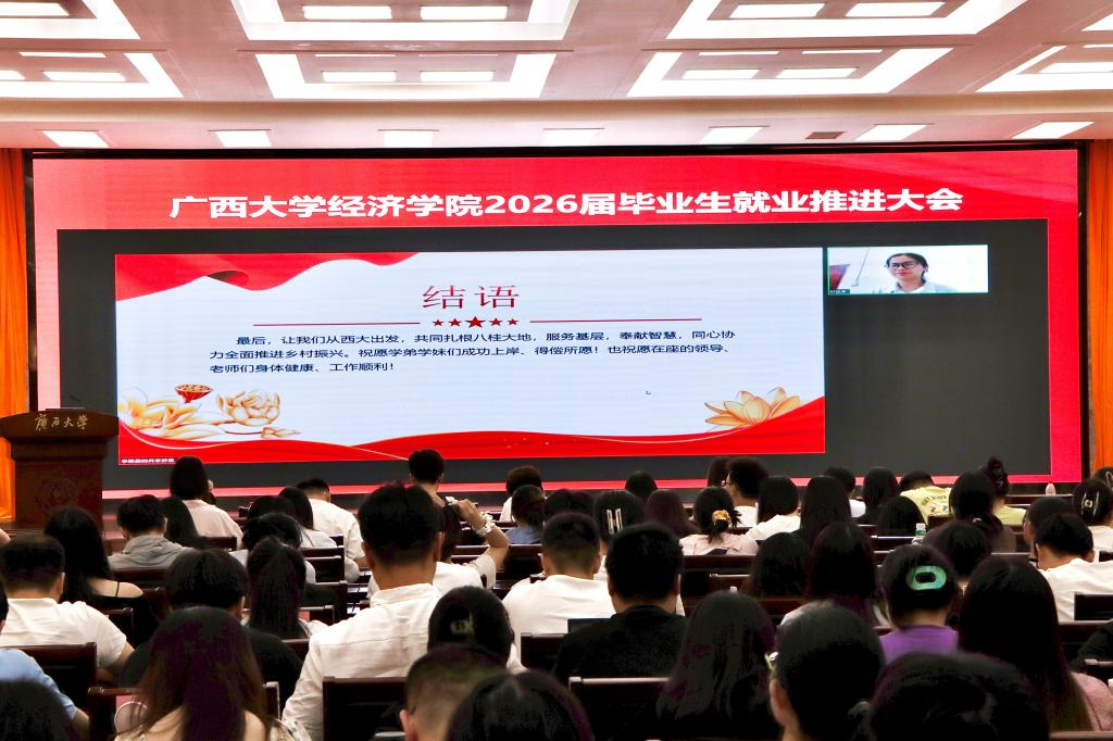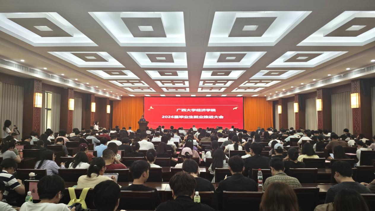 /中国—东盟金融合作学院在君武楼玉林厅召开2026届毕业生就业推进大会,学院党委常务副书记姜玮、党委副书记刘梦娟、校学工部(处)武装部陈榕平、院团委书记王海希、各系主任、毕业班班主任、全体辅导员、优秀校友代表、2026届全体毕业生出席。会议由辅导员于娜主持。