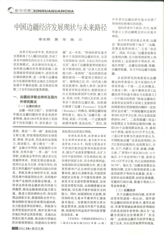 探花 李光辉教授、黄华博士研究生撰写的论文“中国边疆经济发展现状与未来路径”全文被《新华文摘》(2023年第19期)转载,该论文曾发表在《中国经济报告》(2023年第3期)。