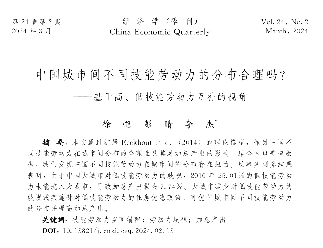 徐恺副教授、暨南大学产业经济研究院李杰教授合作的论文“中国城市间不同技能劳动力的分布合理吗?——基于高、低技能劳动力互补的视角”在《经济学(季刊)》发表。