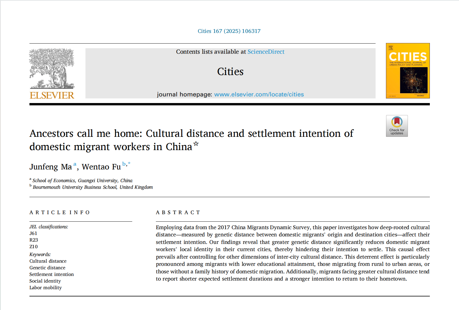 近日,本学院马俊峰助理教授与Bournemouth University商学院付文韬教授合作的论文“Ancestors call me home: Cultural distance and settlement intention of domestic migrant workers in China”在《Cities》期刊正式发表。马俊峰助理教授为论文第一作者,付文韬教授为论文通讯作者。本研究获得了教育部人文社会科学研究项目的资助。