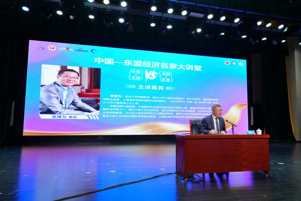 学术院长、中国国际经济合作学会副会长李光辉主持。复旦大学张维为教授、中共中央党校(国家行政学院)张玉杰教授应邀作专题演讲,围绕中国—东盟合作与全球治理展开深度对话。