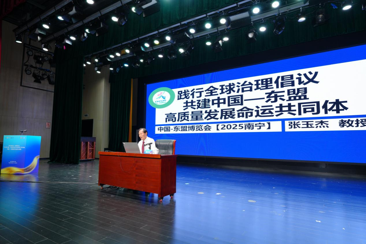 张玉杰教授以《践行全球治理倡议,共建中国—东盟高质量发展命运共同体》为题发表演讲。他从世界历史格局的演变切入,分析了当前全球治理体系面临的失衡与失序等重大挑战,指出发展、安全、文明等议题亟需新型国际公共产品的支撑。张玉杰教授系统阐述了中国提出的全球发展、安全、文明与治理四大倡议,强调这些倡议彰显了中国在国际舞台上的大国担当。他进一步表示,中国正以实际行动推动多边主义与开放协作,引领区域合作迈向更高水平,为构建人类命运共同体注入坚实力量。