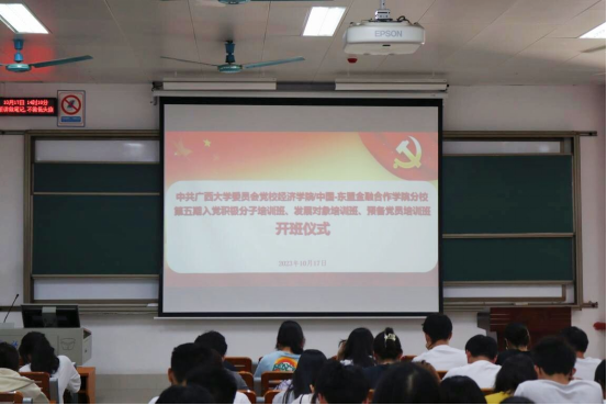 /中国-东盟金融合作学院分校第五期培训班开班仪式在六教301教室举行。学院党委书记陆善勇教授、党委副书记陈卉娟、专职组织员王入仕、专职辅导员曾宪友、专职辅导员何湘桂出席仪式。