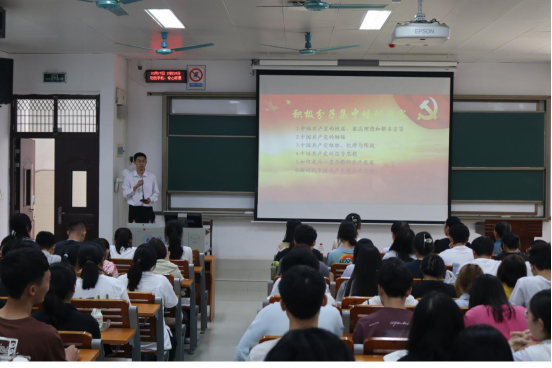 随后,党建秘书处周方同学对本期党校班教学计划及纪律要求进行讲解。他分别对入党积极分子、发展对象和预备党员的集中培训内容进行介绍,并重点强调了党校班的纪律要求,提醒学员们要服从组织管理,严守党校班的各项纪律规定。