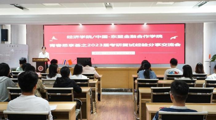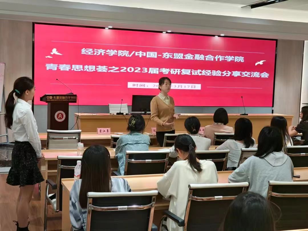 /中国-东盟金融合作学院考研复试经验分享会在学院101室召开。学院党委副书记陈卉娟、团委书记王海希、团委副书记蒙江勇出席会议。22级应用经济学硕宁文俏、22级保险专硕周思颖、22级国际商务专硕赵宇轩、22级金融专硕周红兰四位同学作为嘉宾分享了考研复试的宝贵经验,为探花