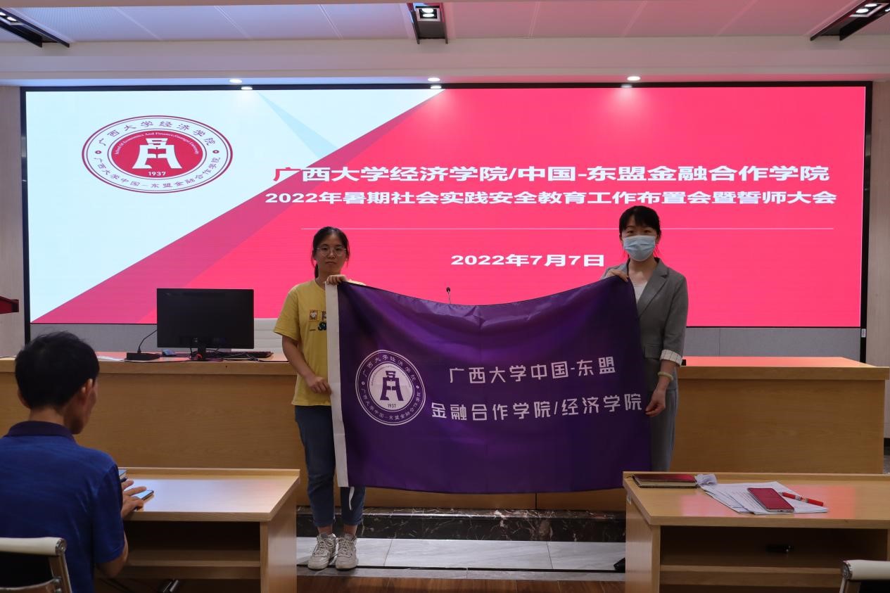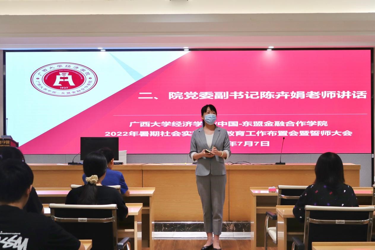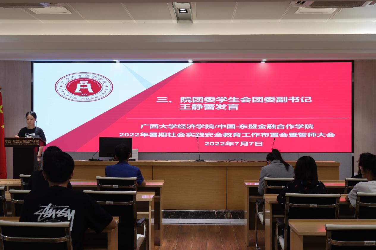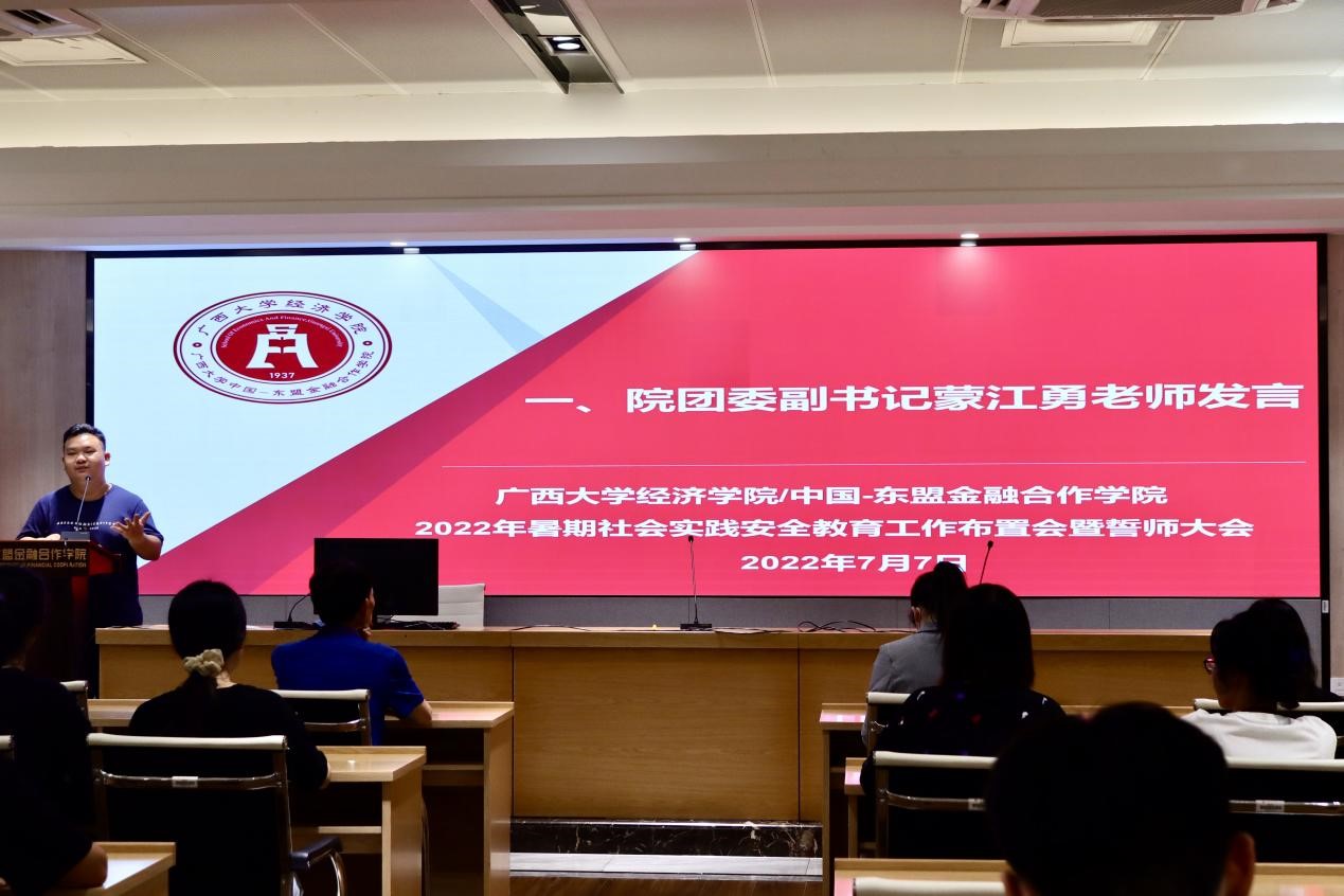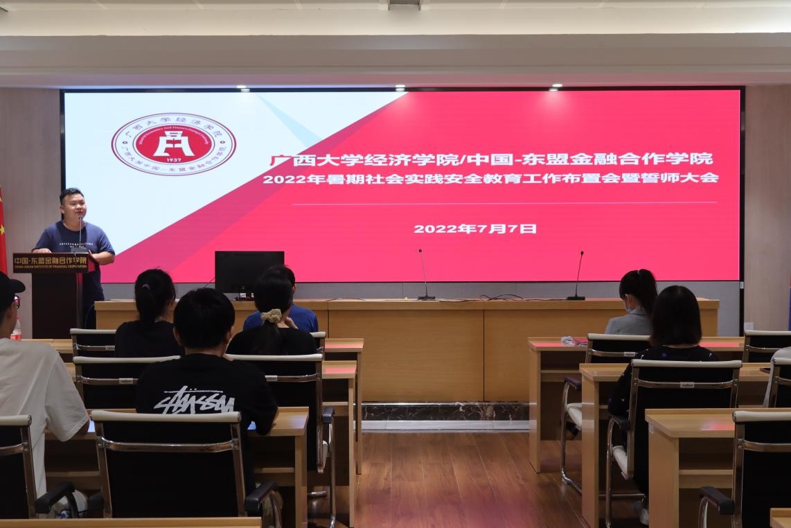 /中国-东盟金融合作学院于学院101会议室内召开2022年暑假社会实践安全教育工作布置会暨誓师大会。院党委副书记陈卉娟、院团委副书记蒙江勇、学工组辅导员蒙昀、曾宪友、覃晓阳、院团委副书记(本科生)王静蕾及探花