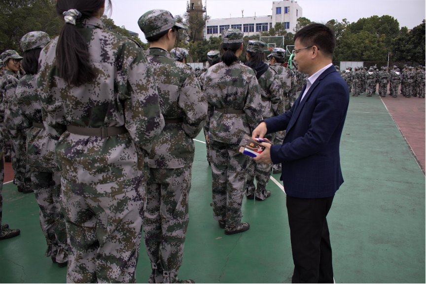 最后学院领导老师们向军训教官和每位学员发放慰问品,并致以亲切的问候与关怀,勉励大家勇于磨练自我、超越自我,圆满完成军训任务!