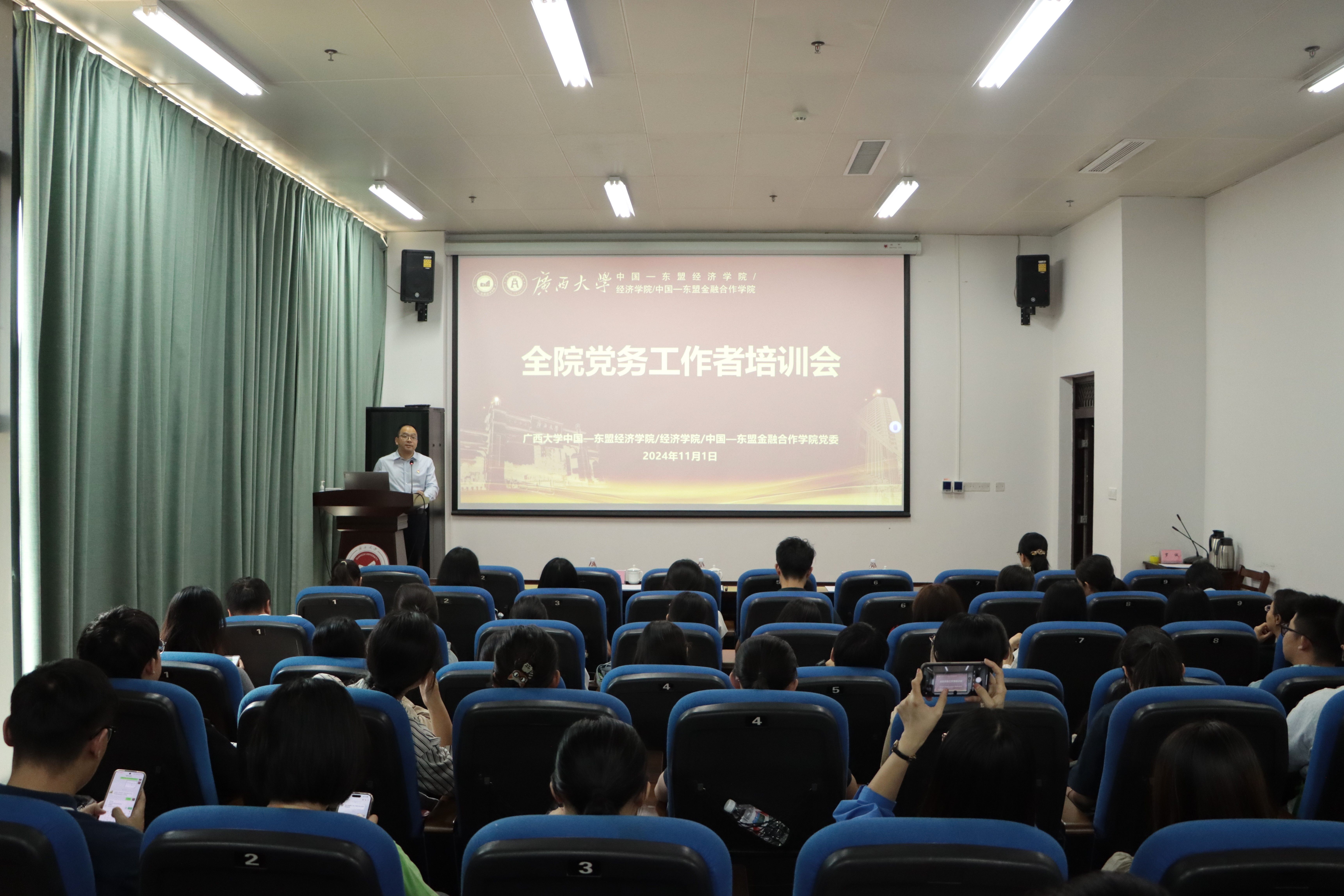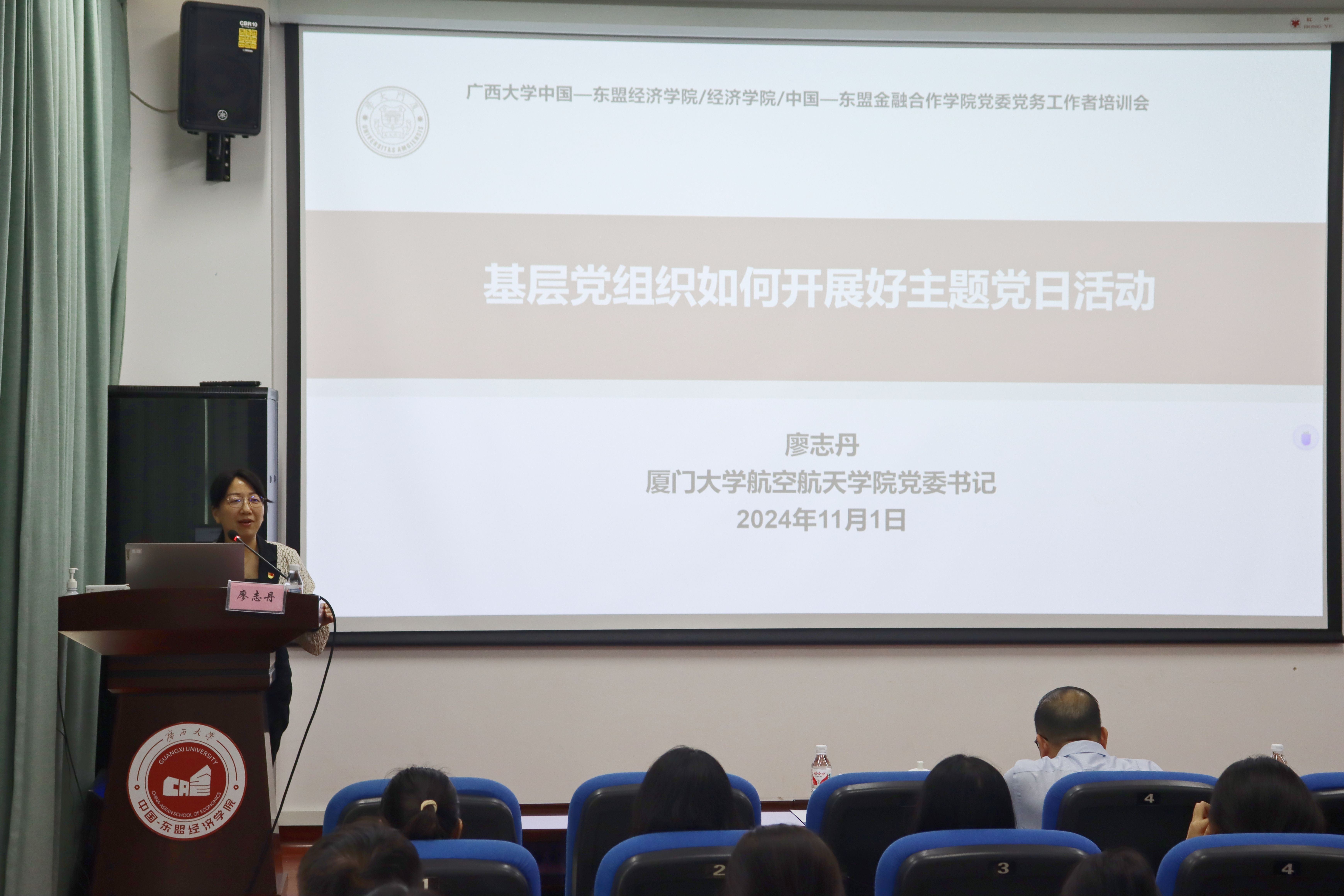 /中国—东盟金融合作学院党委在学院A107报告厅召开全院党务工作者培训会。本次会议特别邀请到厦门大学航空航天学院党委书记廖志丹作为主讲嘉宾。学院党委常务副书记罗诚主持培训会并作动员讲话。学院党委副书记、纪委书记陈卉娟、学院教工党支部和学生党支部全体支委参加培训会。