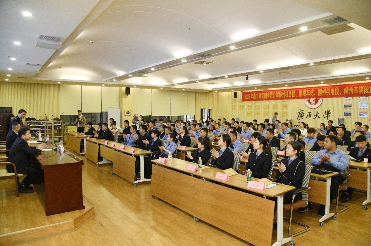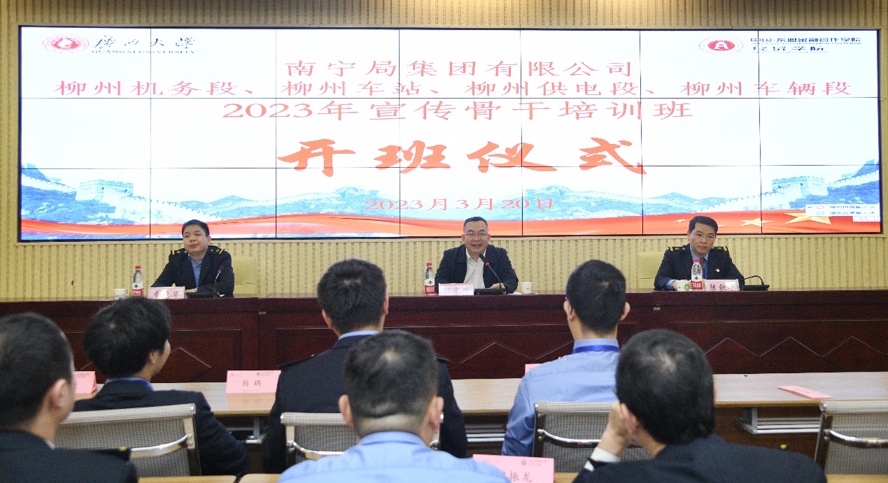 承接的南宁铁路局集团有限公司基层站段2023年宣传骨干培训班正式开班。学院党委副书记、副院长郭宇路,南宁铁路局集团有限公司柳州机务段融媒体主任陆钦平,柳州车站党群工作科主任李德华出席开班仪式。