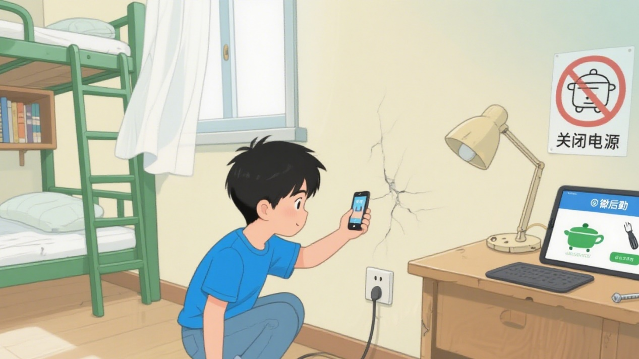 微后勤”平台提交报修申请。并做到不在宿舍内使用违规电器、私拉乱接电线,离开宿舍时务必关闭所有电源,共同维护安全环境。