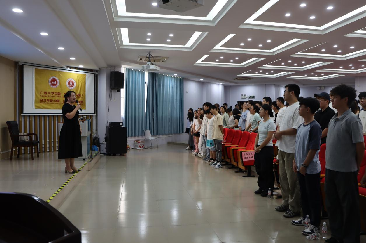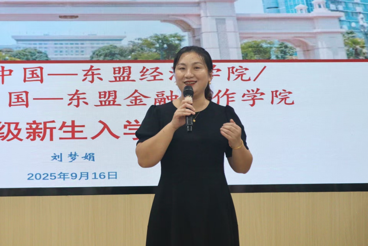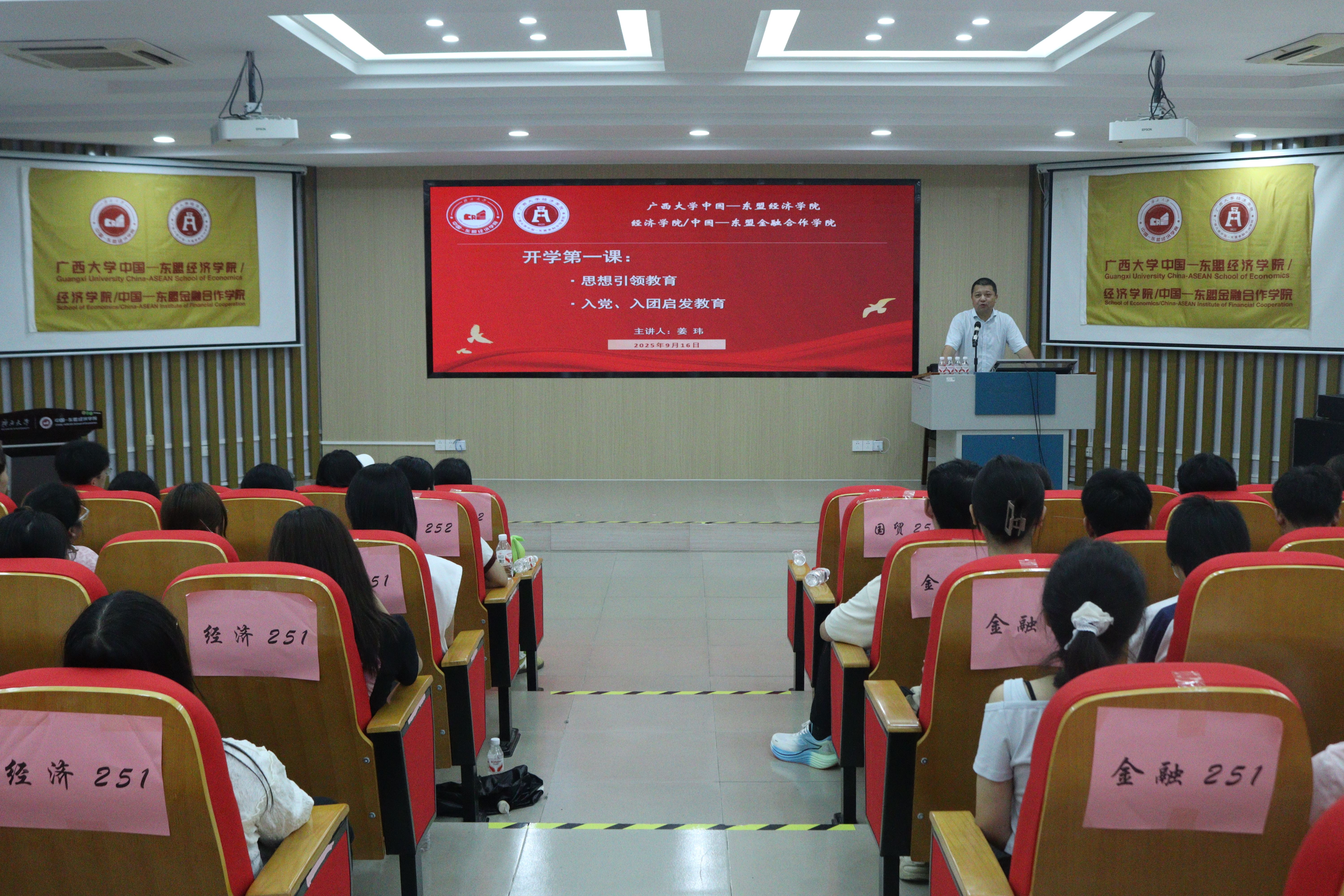 /中国—东盟金融合作学院2025级新生“开学第一课”在214报告厅温情开讲。学院党委常务副书记姜玮、党委副书记刘梦娟围绕“坚定理想信念,启航青春征程”主题,与全体新生进行了一场有高度、有温度、有深度的对话,共同拉开大学生活的序幕。本次活动由辅导员于娜、曹魏主持。