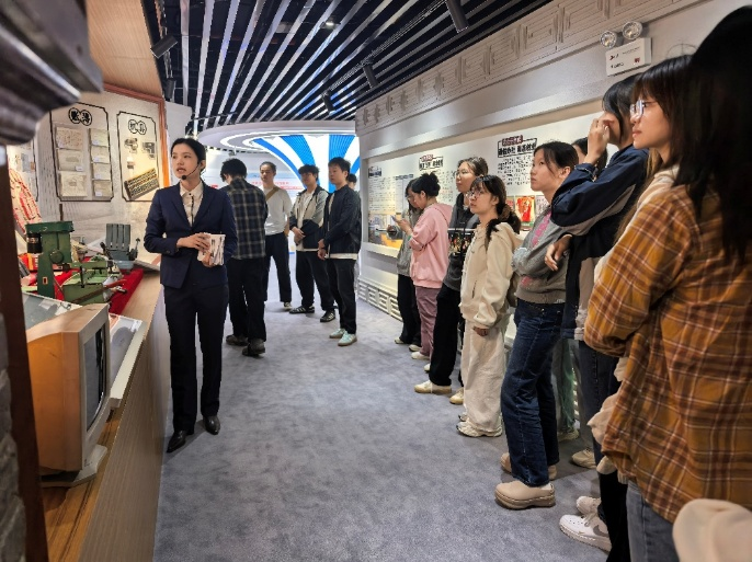 同学们首先来到位于63层的行史馆,在讲解员的带领下,沿着时间轴了解广西农商联合银行的发展历程、改革创新与服务“三农”和地方经济的典型案例。展墙上的老照片、实物陈列和文字故事,让同学们把课堂上抽象的“银行体系”、“区域性金融机构”具象为一条扎根本土、服务实体的金融脉络。