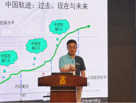 随后,程名望教授利用主流经济学的框架和方法,根据中国经济数据以及统计模型,直观地展示中国经济增长的周期规律,带领研究生们从历史和国际的视角看待中国经济发展。他结合党的二十大报告内容,梳理了改革开放之后中国经济高速增长的主要原因:一是科学化,尊重规律与常识;二是市场化,资源优化配置和体制改革;三是全球化,开放包容,合作共赢。放眼未来,程名望教授形象地指出,中国的发展正从“一好学生”向“三好学生”转变,即向政治上的红色江山(安全稳定)、经济上的金山银山(经济富足)以及环境上绿水青山(生态文明)转变。他鼓励在座的研究生们将研究视线聚焦于祖国大地,深入探索研究中国经济模式的独特之处,为中国经济的未来发展贡献智慧和力量。