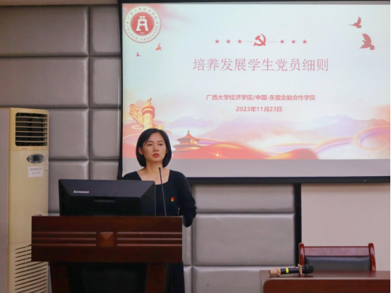 学院专职辅导员何湘桂老师讲解学院培养发展学生党员细则。何老师首先对目前学院学生发展党员的具体情况向大家作了说明,并详细介绍了学院培养发展学生党员的流程、条件和要求,提高了入党积极分子对学院培养发展学生党员过程的认识。她希望同学们都能够端正态度,对自己高标准严要求,在各个方面以党员的标准严格要求自己,不断为成为一名光荣的中国共产党党员而努力。