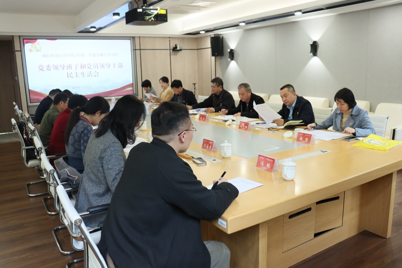 /中国-东盟金融合作学院在学院102会议室召开2022年度党委领导班子和党员领导干部民主生活会。校党委常委、副校长田利辉和校党委巡察组傅忠到会指导工作,学院党委领导班子成员和师生党员代表参加会议,民主生活会由学院党委书记陆善勇主持。