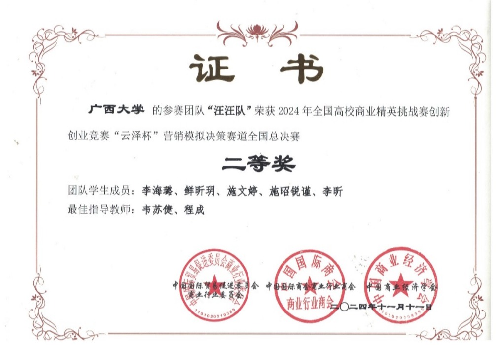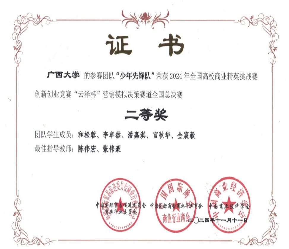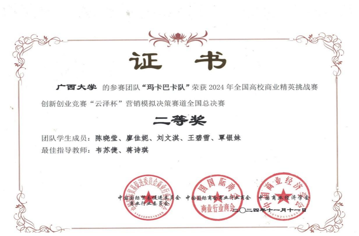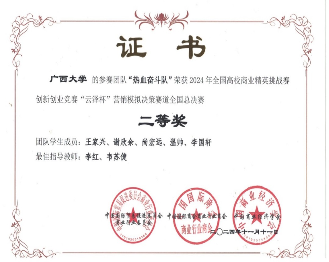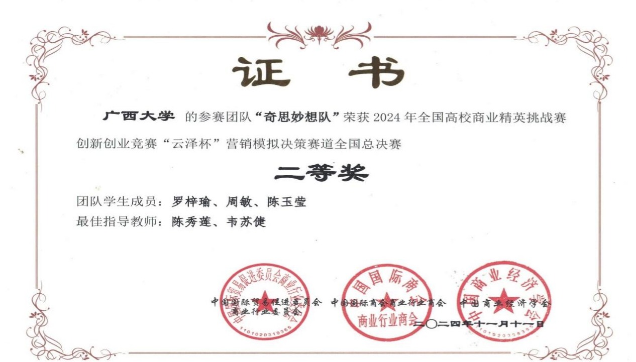 近日,2024年全国高校商业精英挑战赛创新创业竞赛“云泽杯”营销模拟决策赛道全国总决赛落下帷幕。此次竞赛共有来自全国20余个省、自治区、直辖市的400余所院校近两万名学生共同参与。经过激烈的校赛和全国预选赛比拼,探花