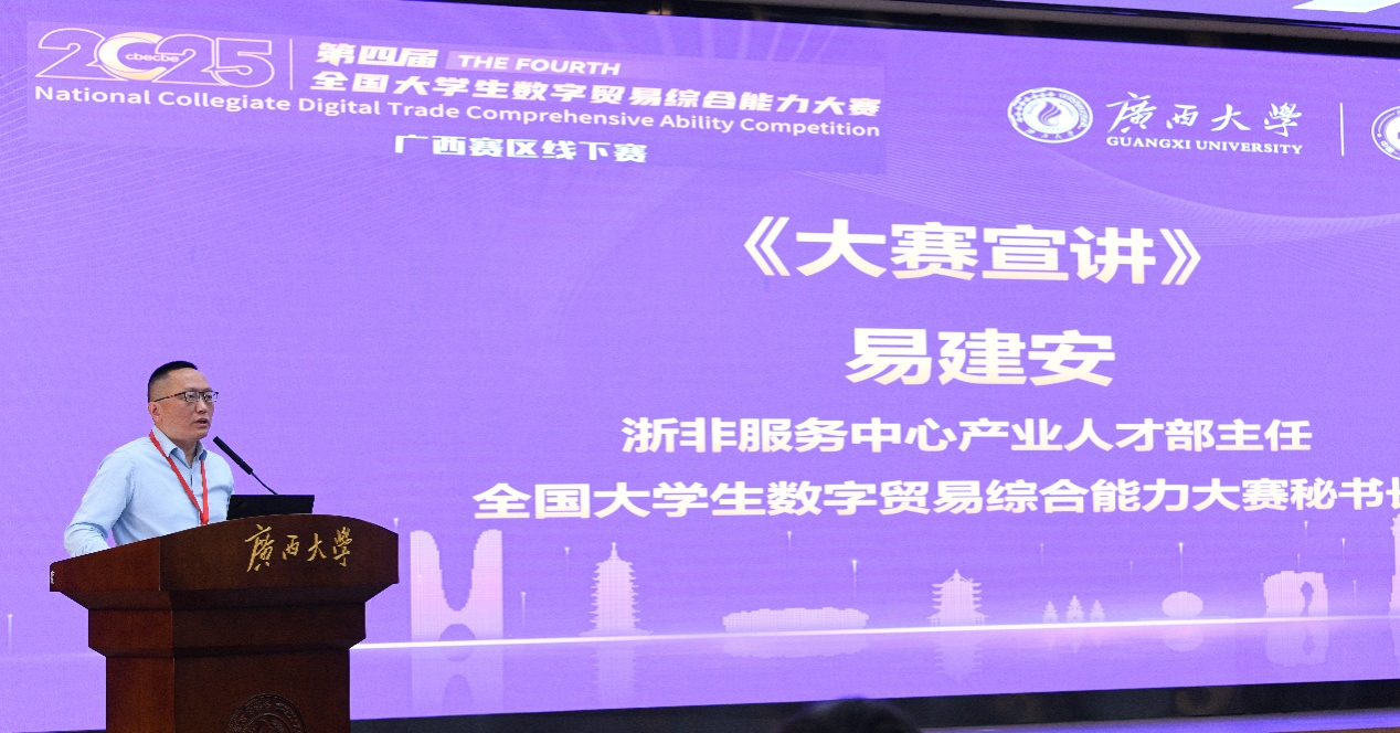易建安代表大赛组委会对比赛内容进行宣讲,详细介绍了2025年第四届数字贸易大赛四大赛道的具体内容,强调了大赛真题真做、产教融合的特点。