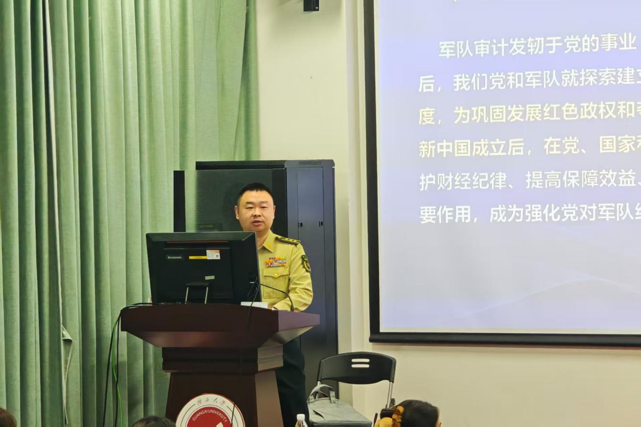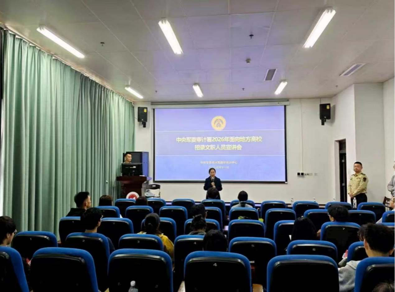 随后举行的宣讲会由于娜老师主持。107教室内座无虚席,洋溢着青春与期待的氛围。主讲人帅元同志立足军队审计工作的特殊使命,系统阐述了军队审计在强军兴军中的职能定位,全面解读了文职人员制度的独特优势与发展前景,详细介绍了军委审计署招录文职人员的相关政策。他对文职人员的身份属性、岗位职责与发展路径的精彩解读,为同学们勾勒出一幅清晰且充满吸引力的职业画卷。