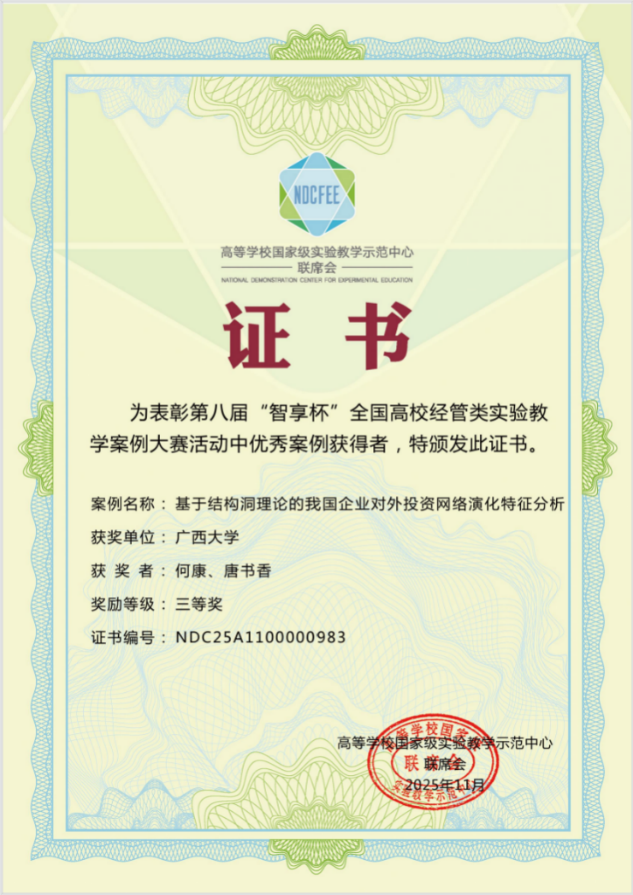 何康、唐书香教师完成的《基于结构洞理论的我国企业对外投资网络演化特征分析》案例,凭借精巧的案例设计与精彩的现场发挥,荣获教师组三等奖;2025级金融专硕1班农轩莹、陈景露,金融本科232班裴相博同学组成的团队,在何康老师指导下,以《运用Python测度债券的久期和凸性及其可视化》为案例,将技术工具与专业充分融合,荣获学生组三等奖。这些奖项的获取,充分展现了探花