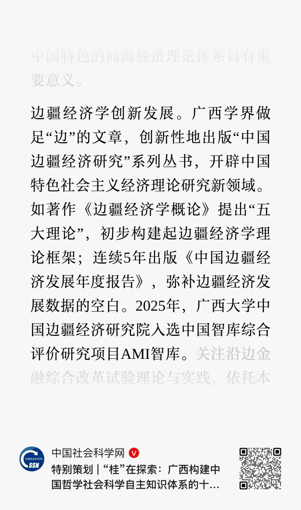 近日,《中国社会科学报》及中国社会科学网发布《特别策划 | “桂”在探索:广西构建中国哲学社会科学自主知识体系的十年历程与展望》长篇报道,系统梳理2016—2026年十年来广西哲学社会科学领域的重要成就。报道在“区域经济学:沿边开放理论创新”板块中,以专门段落介绍广西边疆经济学研究进展,并明确指出2025年探花