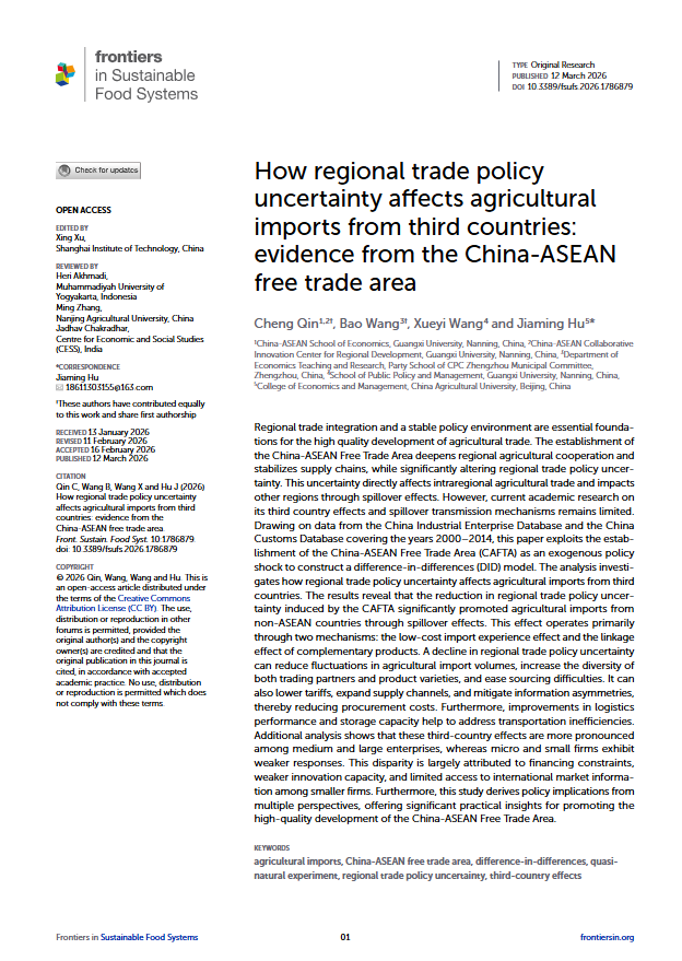 教师覃诚作为共同第一作者,与合作者共同完成的学术论文 “How regional trade policy uncertainty affects agricultural imports from third countries: evidence from the China-ASEAN free trade area”(《区域贸易政策不确定性如何影响自第三方国家的农产品进口——来自中国-东盟自由贸易区的经验证据》)在《Frontiers in Sustainable Food Systems》正式发表。该研究得到广西高校人文社会科学重点研究基地中国—东盟区域发展协同创新中心基金项目(CWYB202405)、探花