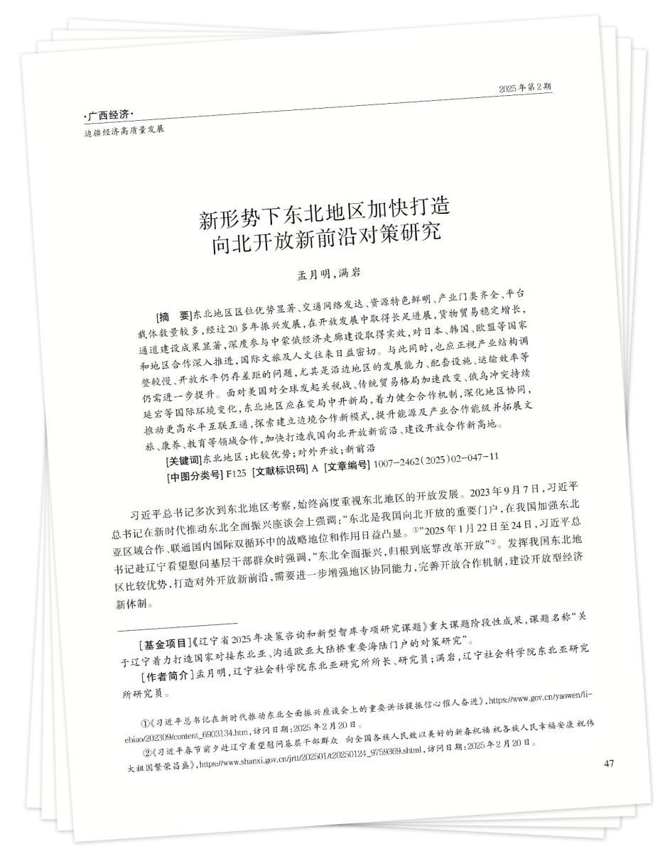 [摘 要]东北地区区位优势显著、交通网络发达、资源特色鲜明、产业门类齐全、平台载体数量较多,经过20多年振兴发展,在开放发展中取得长足进展,货物贸易稳定增长,通道建设成果显著,深度参与中蒙俄经济走廊建设取得实效,对日本、韩国、欧盟等国家和地区合作深入推进,国际文旅及人文往来日益密切。与此同时,也应正视产业结构调整较慢、开放水平仍存差距的问题,尤其是沿边地区的发展能力、配套设施、运输效率等仍需进一步提升。面对美国对全球发起关税战、传统贸易格局加速改变、俄乌冲突持续延宕等国际环境变化,东北地区应在变局中开新局,着力健全合作机制,深化地区协同,推动更高水平互联互通,探索建立边境合作新模式,提升能源及产业合作能级并拓展文旅、康养、教育等领域合作,加快打造我国向北开放新前沿、建设开放合作新高地。