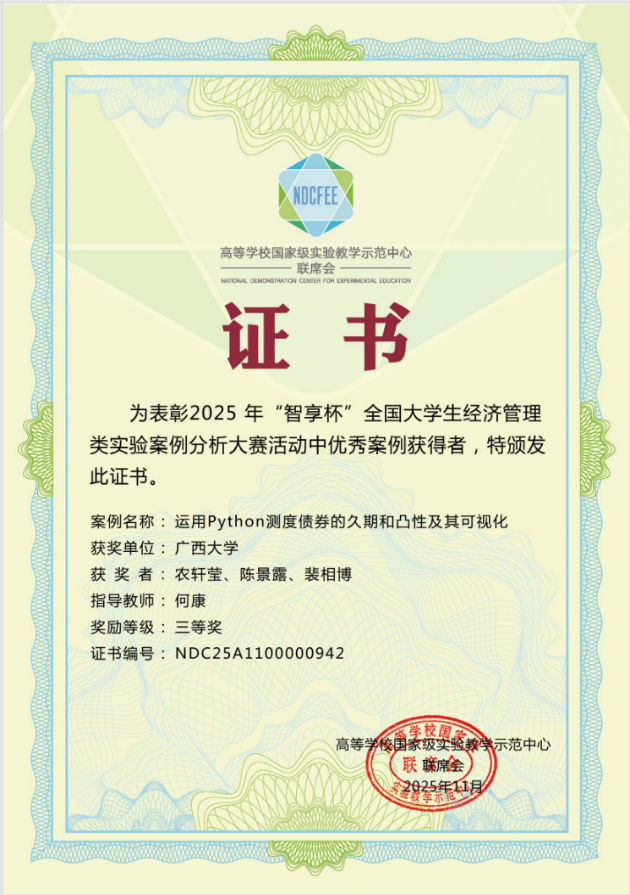 何康、唐书香教师完成的《基于结构洞理论的我国企业对外投资网络演化特征分析》案例,凭借精巧的案例设计与精彩的现场发挥,荣获教师组三等奖;2025级金融专硕1班农轩莹、陈景露,金融本科232班裴相博同学组成的团队,在何康老师指导下,以《运用Python测度债券的久期和凸性及其可视化》为案例,将技术工具与专业充分融合,荣获学生组三等奖。这些奖项的获取,充分展现了探花
